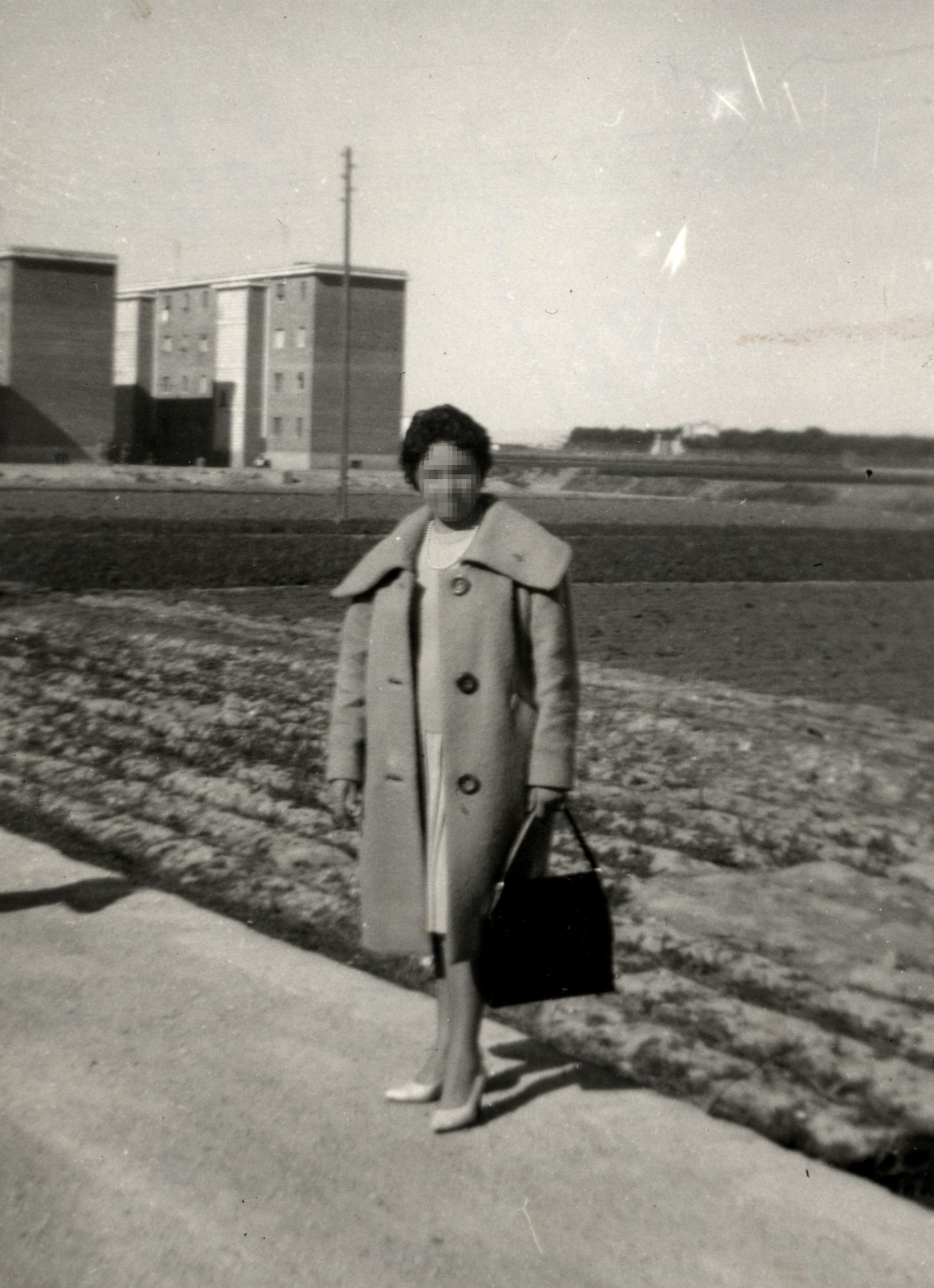 A tenor de la nota escrita en el reverso de la fotografía —la caligrafía conserva, por añadidura, ciertos rasgos infantiles—, nos encontramos en Catarroja, Valencia, en el año 1961. Los dos bloques de viviendas que asoman al fondo de la imagen confirman la ubicación real: se trataría de un punto próximo al por entonces límite oeste de la población, a lo largo del eje que conduce, aún hoy, al cementerio municipal. En efecto, allí se habían elevado, apenas unos años antes, cuatro bloques de viviendas sociales promovidos por el Instituto Nacional de la Vivienda al amparo del Decreto de 18 de octubre de 1957 conocido popularmente como Plan Riada. La imagen, de hecho, no es muy distinta de aquellas otras oficiales que sirvieran de propaganda a la empresa constructora de la Obra Sindical del Hogar y el Ayuntamiento de Valencia destinada a realojar a los damnificados de las dramáticas inundaciones del Turia. Pero el retrato de la mujer humaniza las asperezas de las nuevas construcciones y puede que hasta conjure el triste recuerdo; su orgullo y dignidad podrían residir, quién sabe, en uno de aquellos pisos, acaso recién adquirido por su nueva familia: su hogar y su destino.